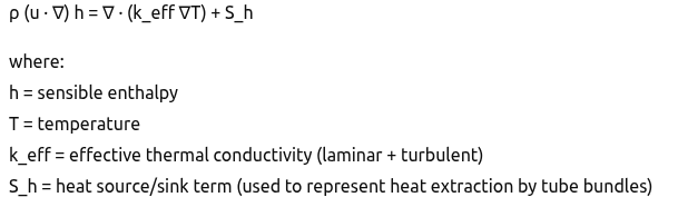 Heat exchanger regions include volumetric heat sink terms to represent heat extraction by steam/water circuits