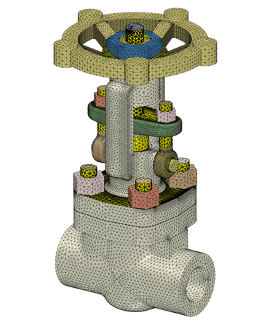 The finite element model represents the full 3D geometry of the gate valve including: